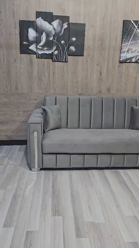 This sophisticated Turkish-style sofa bed combines timeless elegance with practical functionality. Featuring distinctive Chester lines along the arms, it delivers authentic design appeal whilst maintaining contemporary comfort. The plush grey upholstery provides a neutral aesthetic that complements any interior scheme. Integrated storage compartments offer valuable space-saving solutions for modern living. The dual-purpose design seamlessly transitions from stylish seating to a comfortable sleeping surface, making it ideal for compact homes, guest rooms, or multi-functional spaces. Built with quality craftsmanship, this piece represents a smart investment in both style and versatility.